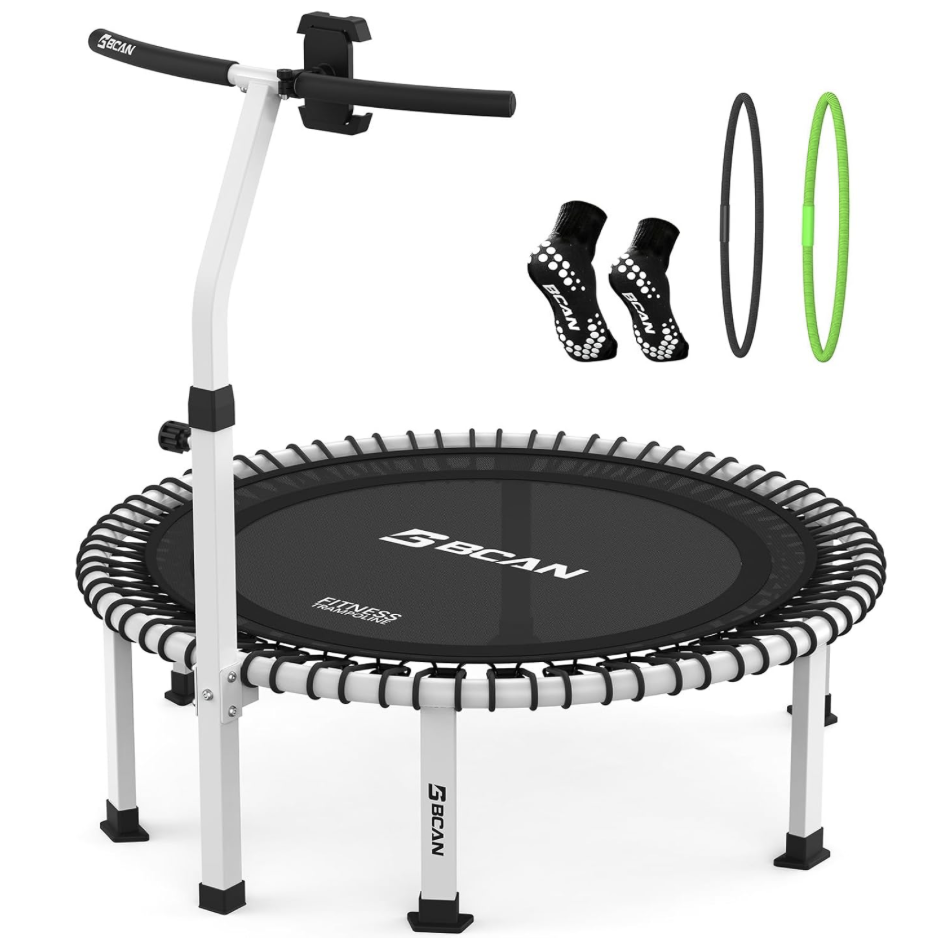 An ideal starter rebounder is the BCAN classic model which can hold up to 450lbs on the 40″ & 550lbs on the 48″. This trampoline has 32 bungees with a unique foldable option.